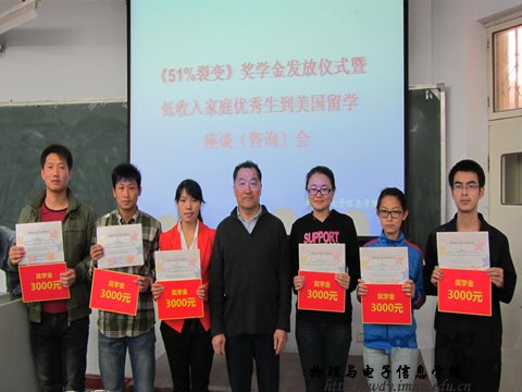 2014年5月8日下午,我院在田楼七共举行了《51%裂变》奖学金发放仪式暨低收入家庭优秀生美国留学座谈会。出席此次活动的有《51%裂变》奖助学基金发起人单明先生、我校校友会常务副秘书长陈佩文老师及我院党总支书记阿梅老师、特古斯院长;党总支副书记何小龙主持了座谈会,团总支萨其尔老师、学工办宋志强老师及各班班主任老师、同学近两百人参加了座谈会。